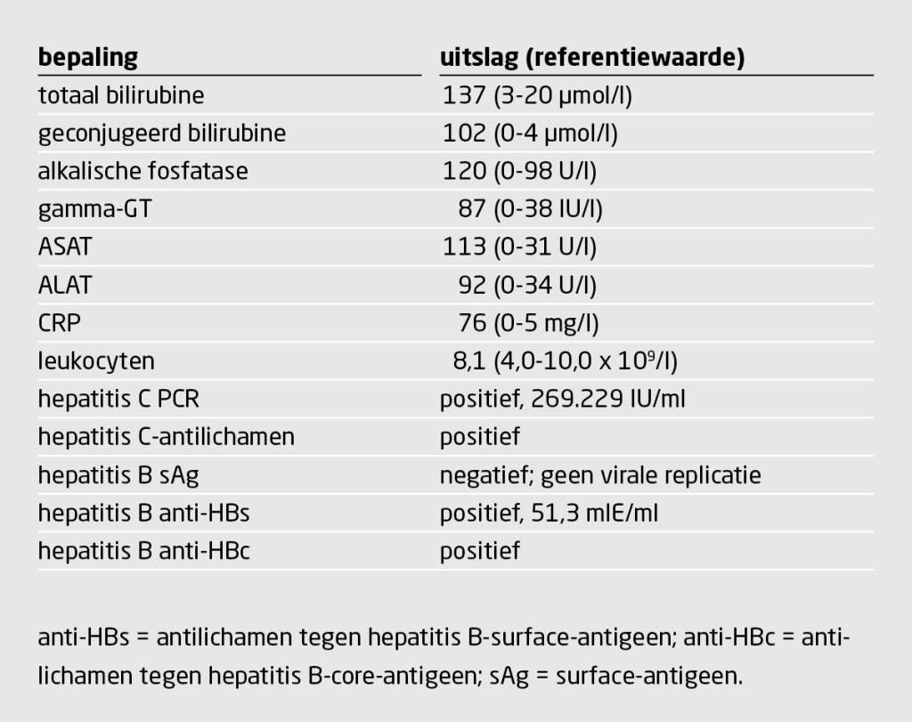 Severe acute respiratory syndrome coronavirus 2 (SARS-CoV-2)-infectie (covid-19) ontwikkelde zich tot een pandemie begin 2020.1 Verschillende vaccins tegen covid-19 zijn met een ongekende snelheid ontwikkeld, waarvan sommige met behulp van nieuwe technologieën zoals bij de mRNA-gebaseerde vaccins. Hoewel grootschalige fase 3-trials bewijs leverden voor de werkzaamheid en veiligheid, is registratie van zeldzame complicaties cruciaal voor toekomstig veilig gebruik van deze nieuwe technologieën. Hier rapporteren wij een casus van hepatitis C-virus (HCV)-reactivatie na covid-19- vaccinatie met het mRNA gebaseerde anti-covid-19-vaccin van BioNTech/Pfizer.