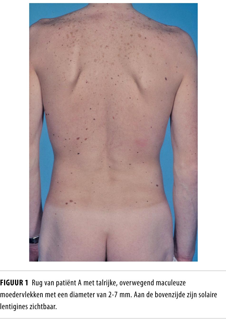 Bij lichamelijk onderzoek zien wij een niet-zieke man met verspreid over het lichaam moedervlekken die overwegend maculeus zijn en die variëren in diameter van 2-7 mm; alleen al op de romp zien we er circa 60 (figuur 1). Sommige naevi zijn licht asymmetrisch en tonen wisselende bruine pigmentatie; dit zijn met name de exemplaren die groter zijn dan 5 mm, in totaal 8. De bovenzijde van de rug toont actinische schade in de vorm van velden solaire lentigines (zie figuur 1).