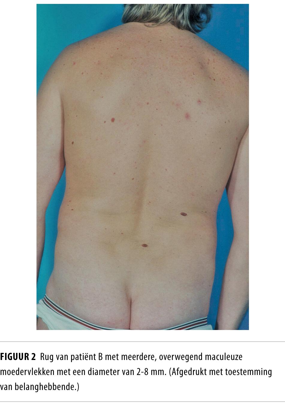 Bij onderzoek zien wij een niet-zieke man met meerdere, overwegend maculeuze moedervlekken, die in diameter variëren van 2-8 mm (figuur 2). Sommige naevi zijn licht asymmetrisch en tonen wisselende bruine pigmentatie; dit zijn met name de exemplaren groter dan 5 mm, in totaal hooguit 4.