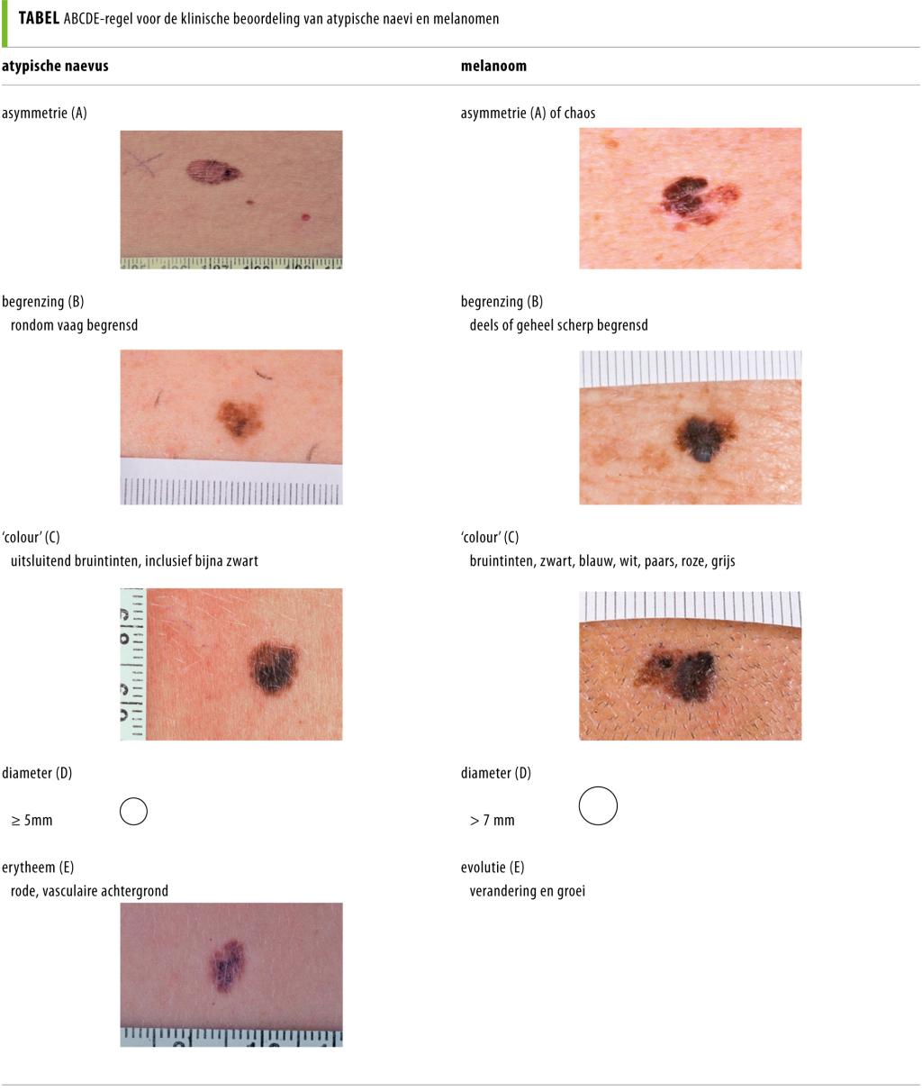 ABCDE-regel Een atypische naevus is een maculeuze of in elk geval vlakke – nooit papillomateuze – naevus met de volgende kenmerken: diameter ≥ 5 mm, asymmetrie, vage begrenzing, niet-egale bruine pigmentatie en wegdrukbaar erytheem (ABCDE-regel). Atypische naevi worden vaker gezien bij mensen die al veel banale naevi hebben. De meeste melanomen lijken echter de novo te ontstaan en niet uit atypische naevi. Hoewel een vroegmelanoom lijkt op een atypische naevus, zet de neoplastische ontwikkeling alleen bij een vroegmelanoom door, wat zichtbaar is als een geleidelijke verandering in grootte en aspect. Daarom is het ook zo belangrijk te vragen naar veranderingen.