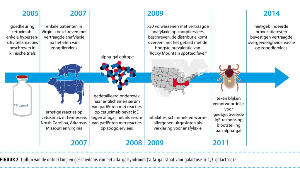 Het ‘alfa-gal’-syndroom is een aandoening waarbij patiënten na het eten van zoogdierenvlees een uitgestelde allergische reactie krijgen doordat ze IgE-antilichamen hebben ontwikkeld tegen het koolhydraat galactose-α-1,3-galactose (alfa-gal), als gevolg van tekenbeten. Dit ziektebeeld varieert van episodische of chronische urticaria tot een levensbedreigende anafylaxie. Als de patiënt geen nieuwe tekenbeten oploopt, gaat de aandoening meestal vanzelf over. In dit artikel beschrijven wij een 68-jarige patiënte met het alfa-galsyndroom.