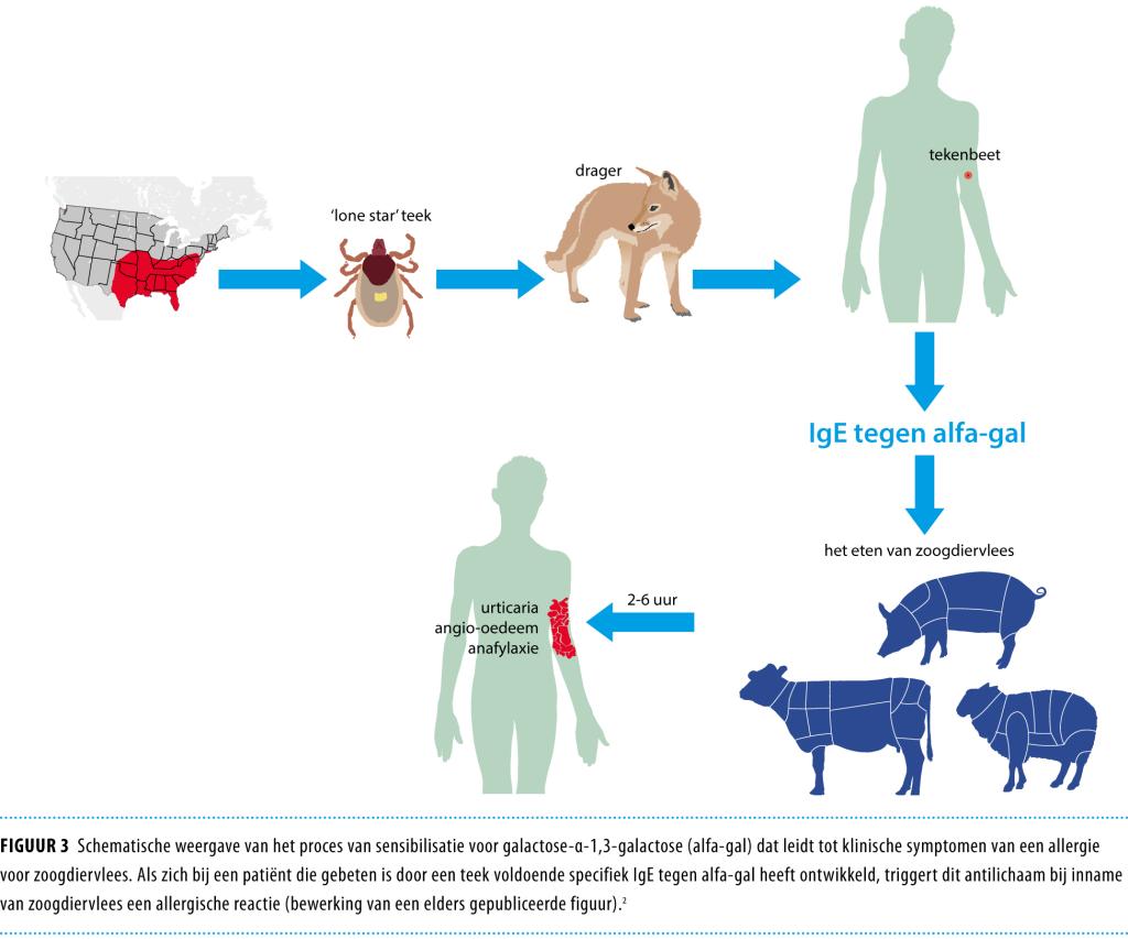 In figuur 2 en 3 staat ten onrechte een kip afgebeeld. De allergische reactie waar het om gaat treedt alleen op na het eten van zoogdiervlees. Hieronder staan de juiste figuren.