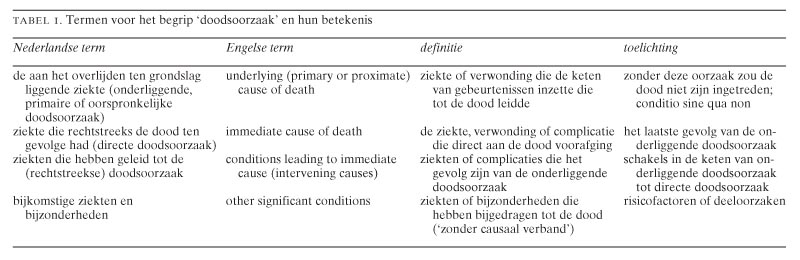 Voor de registratie van doodsoorzaken bestaat een internationaal systeem, vastgelegd in de ‘International code for diseases and causes of death’, waarvan inmiddels de 10e versie is verschenen. De opzet van het formulier voor de doodsoorzakenstatistiek komt in zeer veel landen in de wereld overeen, maar is niet identiek. Op het Nederlandse B-formulier worden de volgende termen gebruikt: ‘ziekte die rechtstreeks de dood ten gevolge had’, ‘ziekten die hebben geleid tot de (rechtstreekse) doodsoorzaak’, ‘de aan het overlijden ten grondslag liggende ziekte’, en ‘bijkomstige ziekten en bijzonderheden, die tot de dood hebben bijgedragen, doch die niet met de onderliggende ziekte en rechtstreekse doodsoorzaak in causaal verband staan’.15 Deze laatste formulering – wel hebben bijgedragen, maar zonder causaal verband – is overigens volgens de wetten van de logica16 en ook juridisch gezien een contradictio in terminis. In tabel 1 is weergegeven welke Engelse termen equivalent zijn en wat deze termen betekenen.