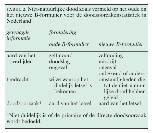 Op het Nederlandse B-formulier zijn – in afwijking van het internationale model – voor natuurlijke dood en niet-natuurlijke dood aparte rubrieken gemaakt.17 Bij de rubriek ‘niet-natuurlijke dood’ wordt niet gebruikgemaakt van de begrippen ‘directe doodsoorzaak’ en ‘onderliggende doodsoorzaak’, maar van het niet nader gespecificeerde begrip ‘oorzaak’, waarbij op het formulier dat sinds 2001 in gebruik is 4 mogelijkheden worden gegeven, namelijk ‘zelfdoding’, ‘misdrijf’, ‘ongeval’ en ‘onbekend of anders’. Onder deze laatste categorie valt ook levensbeëindigend handelen, dat zelfs expliciet op het B-formulier bij de rubriek ‘niet-natuurlijke dood’ is opgenomen. Op het oude B-formulier werden 3 categorieën niet-natuurlijke dood vermeld: ‘zelfmoord’, ‘doodslag’, en ‘ongeval’. Op het nieuwe formulier wordt gevraagd naar de ‘omstandigheden die tot de niet-natuurlijke dood hebben geleid’, waar op het oude formulier nog werd gesproken over ‘de wijze waarop het dodelijk letsel is bekomen’, waarmee blijkens de voorbeelden de toedracht bedoeld wordt. Ook wordt gevraagd naar de aard van het letsel, waarbij niet duidelijk is of de directe of de primaire doodsoorzaak moet worden opgegeven. Als voorbeeld wordt gegeven schedelbasisfractuur. Dit is noch een primaire, noch een directe doodsoorzaak. Het ongeval is de primaire doodsoorzaak en hersenoedeem of inklemming is de directe doodsoorzaak. In tabel 2 zijn de oude en de nieuwe formulering en hun betekenis weergegeven.