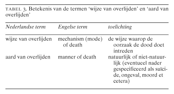 De wijze van overlijden geeft daarbij aan via welk mechanisme de dood intrad. Het ‘mechanisme’ is een symptoom of complicatie (zoals hyperkaliëmie, shock, anoxie, asfyxie of ventrikelfibrilleren) en geen ziekte zoals die in de doodsoorzakenstatistieken voorkomt. De ‘onderliggende ziekte’ leidt via complicaties (het mechanisme) tot de dood. Voor het vaststellen van de aard van het overlijden moet men toedracht en directe en primaire doodsoorzaak kennen. Een ‘voedselvergiftiging’ kan afhankelijk van de omstandigheden in het ene geval als een natuurlijke dood en in het andere geval als een niet-natuurlijke dood gekwalificeerd worden.16 In tabel 3 zijn de Engelse termen die in dit verband gebruikt worden en hun betekenis weergegeven.
