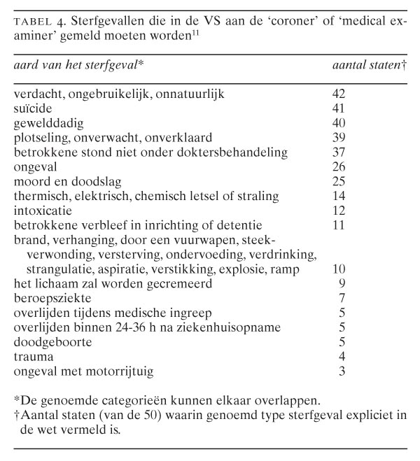 Naast de categorieën vermeld op de overlijdensverklaring is ook in elke staat in de wet opgenomen in welke gevallen een sterfgeval aan de coroner of de ‘medical examiner’ gemeld moet worden. De lijst met sterfgevallen die gemeld moeten worden (tabel 4) verschilt van staat tot staat. Een opvallend verschil met Nederland is de in de meeste staten bestaande verplichting plotseling en onverwacht overlijden en overlijden kort na opname in een ziekenhuis te melden.