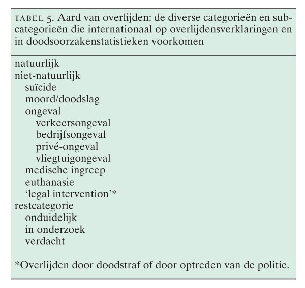 Het onderscheid tussen de begrippen ‘doodsoorzaak’, ‘aard van overlijden’ en ‘wijze van overlijden’ is subtiel, maar essentieel. Dit onderscheid wordt in Nederland niet of nauwelijks gemaakt. In andere landen onderscheidt men deze begrippen in meer of mindere mate. In België worden deze termen op de overlijdensverklaring niet gebruikt. De schouwarts hoeft slechts aan te geven of er ‘gerechtelijk-geneeskundig bezwaar tegen begrafenis of crematie’ bestaat. In Engeland bestaat een vergelijkbaar systeem. De arts die de overlijdensverklaring invult, moet wel de precieze doodsoorzaak opgeven, maar hoeft deze niet te kwalificeren als natuurlijk of niet-natuurlijk. Hij heeft wel de wettelijke verplichting om bepaalde vormen van overlijden aan de coroner te melden. In Duitsland moet de schouwarts naast de precieze doodsoorzaak ook de aard van het overlijden aangeven. Er zijn gewoonlijk 3 categorieën (natuurlijk, niet-natuurlijk, en onverklaard overlijden), soms zelfs 4 of 5. In Amerika vermeldt het Certificate of Death 5 of meer categorieën. Daarnaast bestaat in elke staat, net als in Engeland, een in de wet vastgelegde reeks van sterfgevallen die aan de autoriteiten gemeld moeten worden. In tabel 5 is weergegeven hoe de aard van overlijden internationaal onderscheiden wordt.