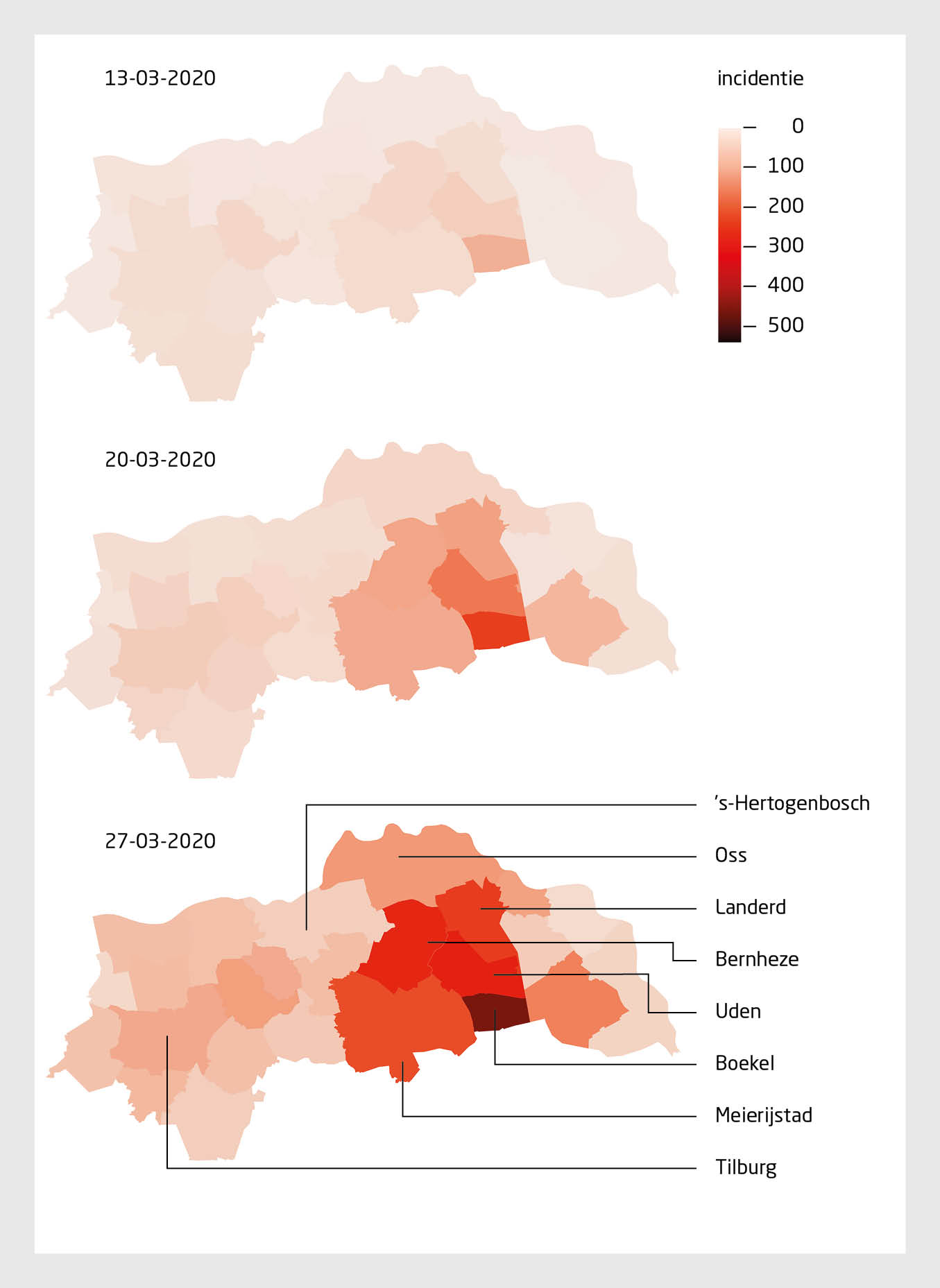 Een kleine 2 maanden later, op 27 februari 2020, werd in Nederland de eerste covid-19-patiënt gemeld bij de GGD Hart voor Brabant.3 Daarna werden in een maand tijd werden 1495 bevestigde covid-19-patiënten gemeld in het werkgebied van de GGD Hart voor Brabant. Dat was ruim 15% van het totale aantal meldingen in Nederland tot dat moment.4 Met name in de zuidoostelijke hoek van de regio was verspreiding van het virus snel gegaan. Figuur 1 laat alle meldingen zien van bevestigde covid-19-infecties in de eerste maand.
