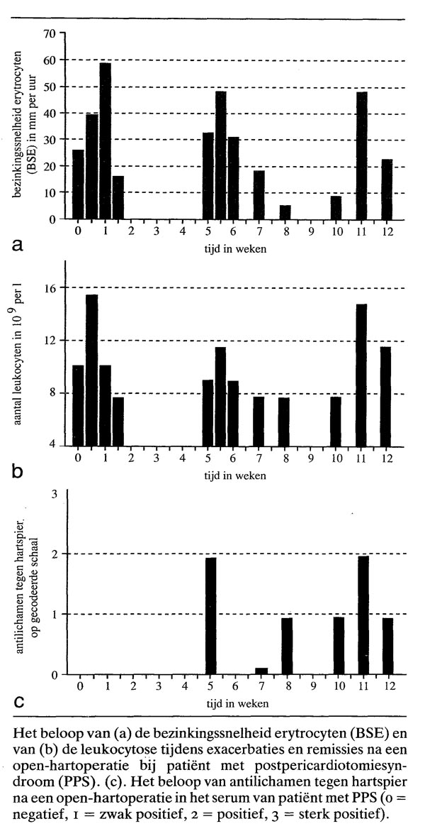 Het meest opvallend is echter het periodieke bijna cyclische karakter van patiënt's ziektebeeld. Bij ons weten is dit niet eerder beschreven in de literatuur. Dit priodieke karakter suggereert een ziekteproces dat door immuuncomplexen gemedieerd wordt; momenteel is de gangbare opvatting dat het syndroom een immunologische grondslag heeft. Er is een verband aangetoond tussen de mate van beschadiging van het myocard tijdens de operatie en het voorkomen van PPS. Een klepvervangende operatie leidt tot meer myocardbeschadiging en geeft vaker aanleiding tot PPS dan coronaria-chirurgie, 22,6 respectievelijk 13,3.2021 Ook blijkt PPS veel minder vaak voor te komen bij patiënten jonger dan twee jaar en bij patiënten ouder dan 70 jaar.12 Een mogelijke verklaring hiervoor is dat op jonge leeftijd het immunologische systeem nog onrijp is en dat op oudere leeftijd de immunologische reactie op stimuli weer afneemt. Daarnaast wordt een gunstig effect verondersteld van passief in de graviditeit verkregen transplacentaire of juist gedurende het leven ontwikkelde antivirale immuniteit.11220 Het PPS zou dan een auto-immuunreactie zijn tegen beschadigd cardiaal weefsel waarbij door een recente of gereactiveerde virusinfectie modificatie van het weefselantigeen plaatsvindt met secundair hiervan neo-antigeenformatie.