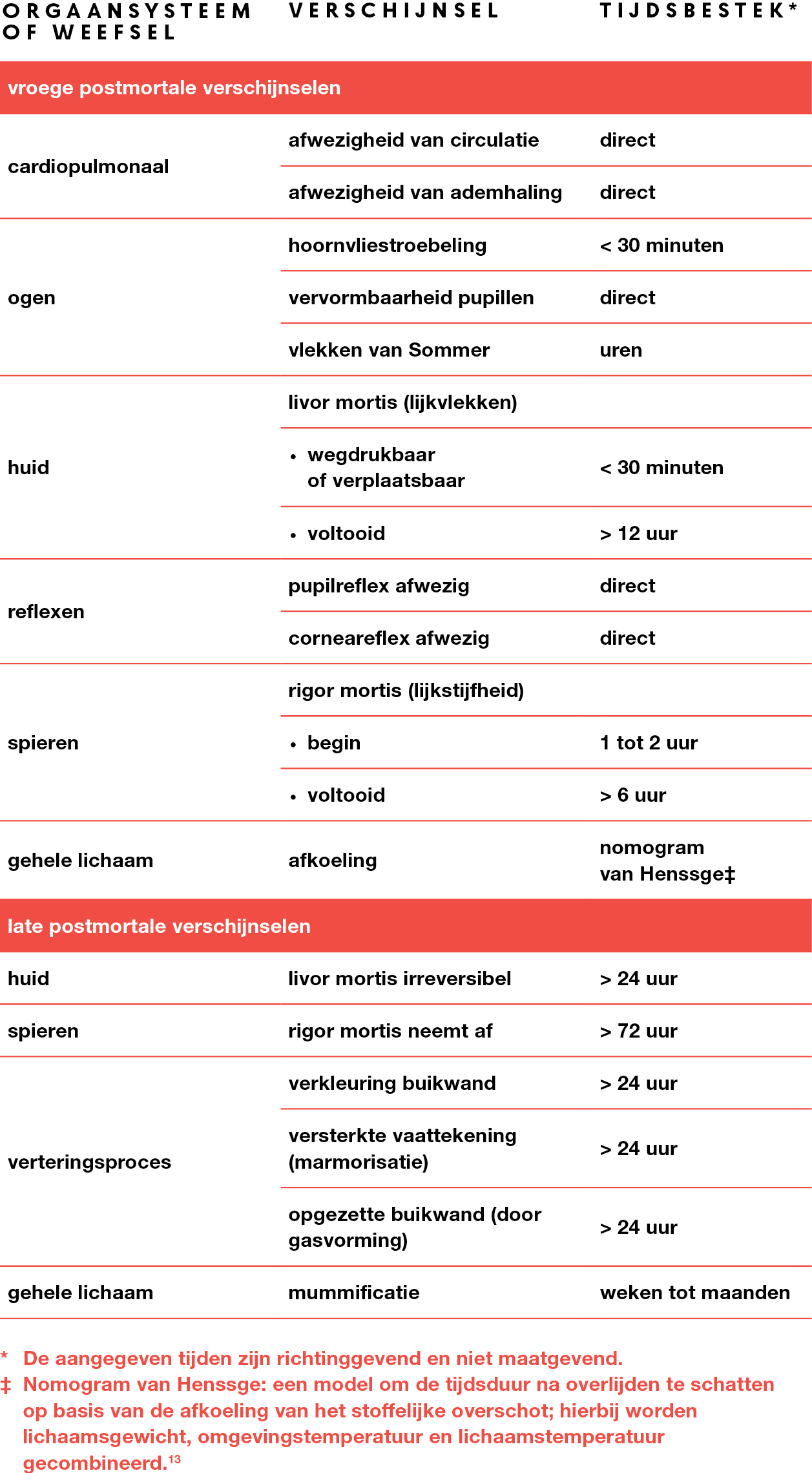 Een infographic die eerder in het NTVG is verschenen, brengt de onderdelen van de lijkschouw in beeld (www.ntvg.nl/C5468). De eerst optredende postmortale symptomen zijn bleekheid en turgorverlies van de huid, lichtstijfheid en vervormbaarheid van de pupillen, en het verlies van spiertonus. In een latere fase – vanaf twee uur na het overlijden – is juist sprake van rigor mortis (lijkstijfheid).9 Verder droogt het lichaam langzaam uit en daalt de temperatuur van het lichaam (in sommige gevallen stijgt de temperatuur tijdelijk). Beide processen zijn afhankelijk van de omgevingstemperatuur, het gewicht van de patiënt, eventuele lichaamsbedekking en gebruikte medicatie.12 Tabel 2 geeft een overzicht van de vroege en late postmortale verschijnselen met een bijbehorende tijdsindicatie.