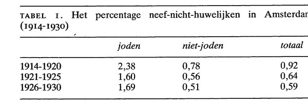 Consanguïene huwelijken zijn vanuit genetisch oogpunt minder gelukkig, omdat ze een verhoogde kans op aandoeningen bij de kinderen geven. In een onderzoek van Polman over de jaren 1906-1948 werd aangetoond dat dergelijke huwelijken (t.m. de 4e graad) in alle provincies (met uitzondering van Zeeland) steeds minder voorkwamen.1 Noord-Brabant had het laagste percentage (minder dan 1 pro mille), wellicht samenhangend met het feit dat destijds circa 90 van de inwoners tot de R.K. kerk behoorde. Deze kerk stelde ten aanzien van bloedverwante huwelijken beperkende bepalingen.1 Voor joden, die vóór de 2e wereldoorlog ongeveer 10 uitmaakten van de Amsterdamse bevolking, golden deze beperkende bepalingen niet (althans voor neef-nicht-huwelijken). Onder hen was het percentage neef-nicht-huwelijken ongeveer 2 (tabel 1). 1