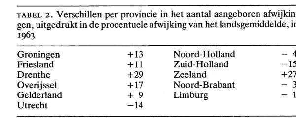 In de enquête aangeboren afwijkingen in 1963 blijkt dat deze afwijkingen destijds in Drenthe en Zeeland een hogere frequentie (29 en 27 boven het landsgemiddelde) hadden (tabel 2). 2 In dezelfde provincies was ook het aantal consanguïene huwelijken het hoogst. Of er enig oorzakelijk verband tussen die twee feiten bestaat, zou verder na te gaan zijn, als de aard van de afwijkingen (recessief erfelijke aandoeningen?) destijds geregistreerd zou zijn. Helaas is deze analyse niet mogelijk.