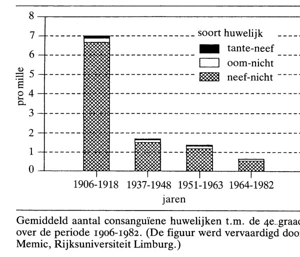 In de figuur wordt het gemiddelde aantal consanguïene huwelijken t.m. de 4e graad gegeven over de periode 1906-1982. In het tijdvak 1980-1982 bedroeg het aantal consanguïene huwelijken in Nederland 169, dat is 0,6 pro mille (waaronder 143 neef-nicht-huwelijken). Het aantal oom-nicht-huwelijken kwam in de periode 1951-1963 veel meer voor dan tante-neef-huwelijken, te weten 150 tegenover 38. In genetisch oogpunt zijn beide combinaties gelijkwaardig.