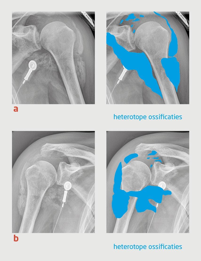 Heterotope ossificatie kan zich op verschillende manieren uiten. Vaak hebben patiënten pijn rond het aangedane gewricht die wordt uitgelokt door zowel passief als actief bewegen van het gewricht. Onze patiënten ervoeren aanvankelijk geen pijn door langdurige sedatie, waardoor de juiste diagnose waarschijnlijk later werd gesteld.