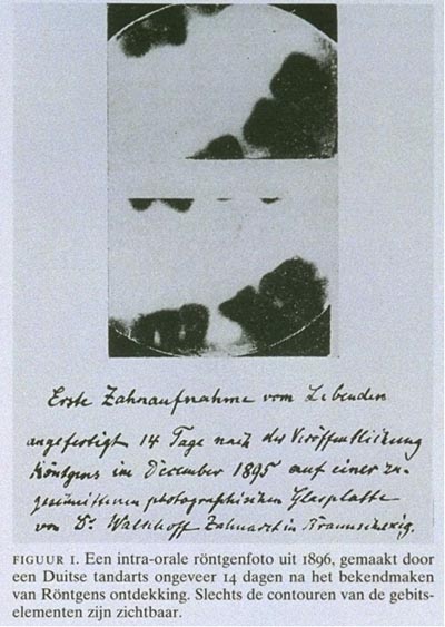 Het is nu 100 jaar na de ontdekking ondenkbaar om de tandheelkunde uit te oefenen zonder gebruik te maken van röntgenstraling en ook voor de toekomst zijn er geen aanwijzingen dat het gebruik van röntgenstraling in de tandheelkunde zal verdwijnen.1 De eerste tandheelkundige röntgenopname werd vermoedelijk gemaakt door een Duitse tandarts, 14 dagen na de bekendmaking van Röntgens ontdekking (figuur 1). Op deze röntgenopname zijn slechts de contouren van de gebitselementen zichtbaar. Tegenwoordig kunnen de gebitselementen met behulp van verschillende technieken afgebeeld worden, waarbij behalve contouren geringe verschillen in contrast, zoals tussen glazuur en dentine, en tussen gezond en carieus glazuur, zichtbaar gemaakt kunnen worden (figuur 2). In dit artikel behandelen wij de belangrijkste ontwikkelingen van het gebruik van röntgenstraling in de tandheelkunde in de afgelopen 100 jaar en geven kort aan wat de verwachtingen voor de toekomst zijn.