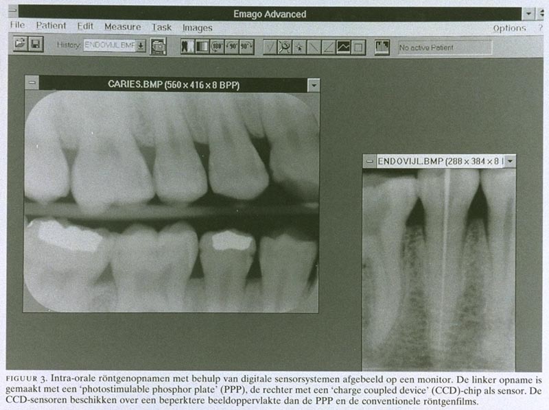 Met de introductie van de digitale radiologie in de tandheelkunde kan de blootstelling aan röntgenstraling bij intra-orale opnamen verder worden gereduceerd.5 Voor tandheelkundige toepassingen wordt het beeld bij de meeste digitale systemen vastgelegd met een ‘charge coupled device’ (CCD)-chip als sensor voor de röntgenstraling. Hiermee wordt het verkregen beeld direct op een monitor zichtbaar (figuur 3). Een andere mogelijkheid is de ‘photostimulable phosphor plate’ als detector. In vergelijking met intra-orale röntgenfilms hebben de meeste digitale systemen als groot nadeel dat de beeldoppervlakte nog zeer beperkt is. Hierdoor moeten meer opnamen gemaakt worden om dezelfde informatie te verkrijgen en wordt het voordeel van de digitale sensorsystemen, de geringere blootstelling aan straling, tenietgedaan. Een voordeel van de digitale systemen met CCD-sensoren daarentegen is de directe beschikbaarheid van het beeld. Vergeleken met de beeldkwaliteit van conventionele röntgenfilms is die van de intra-orale sensorsystemen geringer. Dit is alleen het geval bij zeer kleine afwijkingen en het is daarom de vraag of deze verschillen klinisch relevant zijn. In de toekomst zal de beeldkwaliteit van de sensorsystemen naar alle waarschijnlijkheid toenemen, door de beschikbaarheid van betere sensoren en computers. Wanneer deze systemen minder kostbaar zijn, zal de balans mogelijk in het voordeel van de digitale sensorsystemen uitvallen, vooral door de verminderde blootstelling aan röntgenstraling.