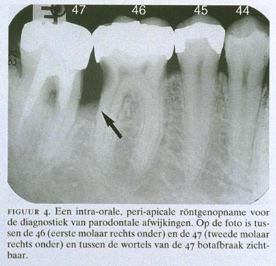Bitewing-foto's worden ook gebruikt voor de diagnostiek van parodontale afwijkingen. Daarbij kan ook gebruik worden gemaakt van peri-apicale röntgenfoto's, waarop de elementen geheel worden afgebeeld. De aanwezigheid, de aard en de uitgebreidheid van aantastingen van het benige deel van het parodontium (steunweefsel) kunnen op röntgenfoto's worden beoordeeld (figuur 4).