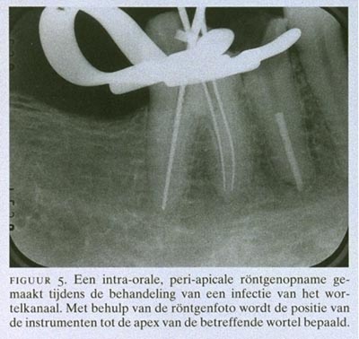 Voor de diagnose van aandoeningen in het peri-apicale gebied (parodontitis apicalis) zijn peri-apicale röntgenopnamen het geschiktst. Door infectie vanuit het wortelkanaal van een element kan een ontsteking van het kaakbot ontstaan. De ontsteking leidt in het algemeen tot osteolyse, die op de röntgenfoto zichtbaar is. Infectie van het wortelkanaal kan echter ook leiden tot botverdichting of een sterk verhoogde afzetting van wortelcement. Ook deze afwijkingen zijn zichtbaar op de röntgenfoto. Bij de behandeling van een geïnfecteerd wortelkanaal worden eveneens röntgenopnamen gemaakt (figuur 5). Met behulp daarvan kan de positie van het instrument ten opzichte van de apex van het element worden bepaald.