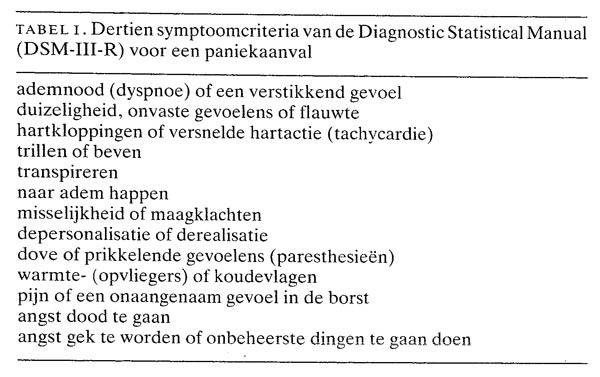 Volgens de Diagnostic Statistical Manual (DSM-III-R) voldoet een patiënt aan de criteria voor een ‘paniekaanval’ wanneer hij minstens 4 van 13 nader gespecificeerde panieksymptomen beleeft (tabel 1).3 Van de 13 symptomen hebben er 2 een cognitief karakter, te weten de angst om dood te gaan en de angst om gek te worden of controle te verliezen. Wanneer de patiënt eveneens voldoet aan aanvullende criteria met betrekking tot de duur van de klachten en de frequentie waarmee en de omstandigheden waaronder de paniekaanvallen optreden, is er sprake van een paniekstoornis.