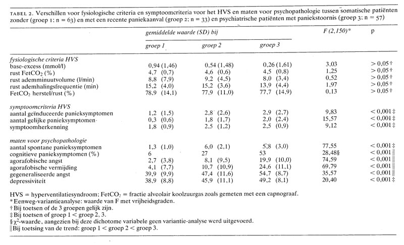 Bij 57 psychiatrische patiënten met een paniekstoornis en 96 somatische patiënten met onbegrepen lichamelijke klachten, mogelijk veroorzaakt door hyperventilatie, werd de hyperventilatie-provocatietest (HVPT) uitgevoerd. Van de 96 somatische patiënten hadden er 33 recentelijk een paniekaanval doorgemaakt. Verschillende fysiologische en symptoomcriteria voor het hyperventilatiesyndroom (HVS) werden bepaald. Bovendien werden uiteenlopende maten voor bijkomende psychopathologie afgenomen.