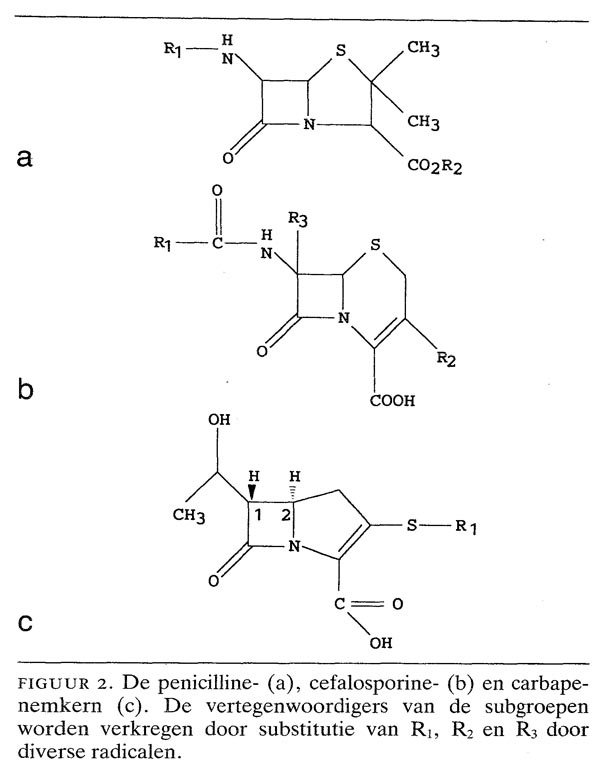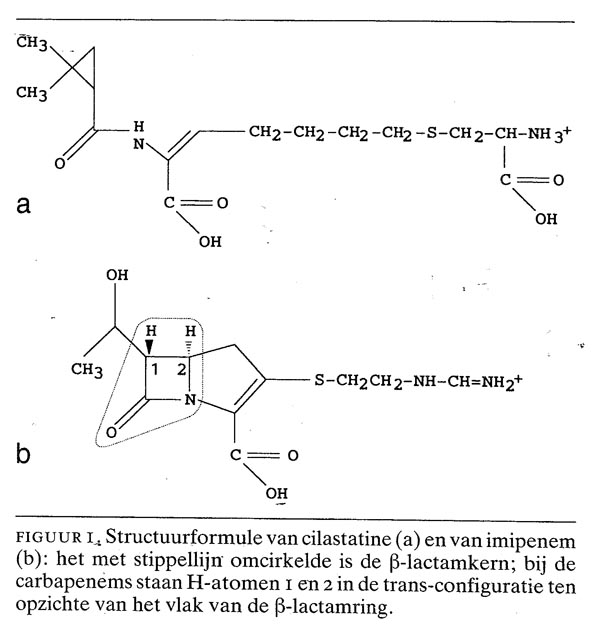 Imipenem is een recente vertegenwoordiger uit de groep van de ?-lactam-antibiotica, stoffen waarvan de chemische structuur wordt gekenmerkt door de aanwezigheid van een ?-lactamring (figuur 1). Deze ring veroorzaakt de antibacteriële werking. De oudste subgroep wordt gevormd door de penicillinen (sinds 1930). Daarna volgen de cefalosporinen (sedert 1970) (figuur 2). Imipenem of N-formimidoyl-thiënamicine is pas in het laatste decennium ontwikkeld en uitgetest. Imipenem is de enige vertegenwoordiger uit de subgroep van de carbapenems die als geneesmiddel in Nederland is geregistreerd.