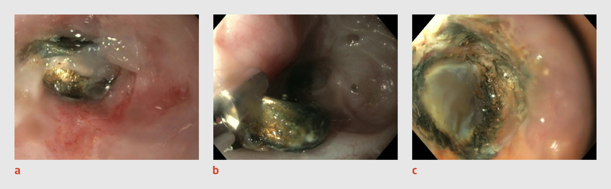 Wanneer bij gastroscopie schade aan de oesofagus is vastgesteld, moet na de verwijdering van het corpus alienum MRI- of CT-onderzoek overwogen worden om fistelvorming tussen de oesofagus en de trachea of de grote arteriën uit te sluiten en om de oesofageale schade te volgen.