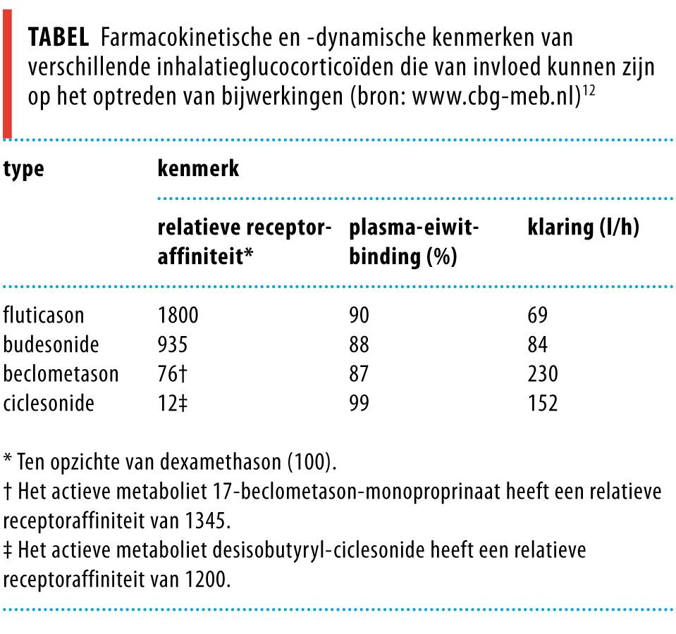 Het risico op systemische bijwerkingen van inhalatieglucocorticoïden neemt toe bij een hogere bindingsaffiniteit van het glucocorticoïd voor de receptor, lagere plasma-eiwitbinding en lagere klaring. De farmacokinetische en -dynamische kenmerken van de verschillende inhalatieglucocorticoïden zijn te vinden in de tabel. In een van de publicaties uit de literatuur valt op dat 3 van de 4 patiënten gedragsveranderingen kregen bij gebruik van budesonide maar niet bij gebruik van beclometason.3 Dit zou kunnen komen door een verschil in relatieve receptoraffiniteit en in klaring.12