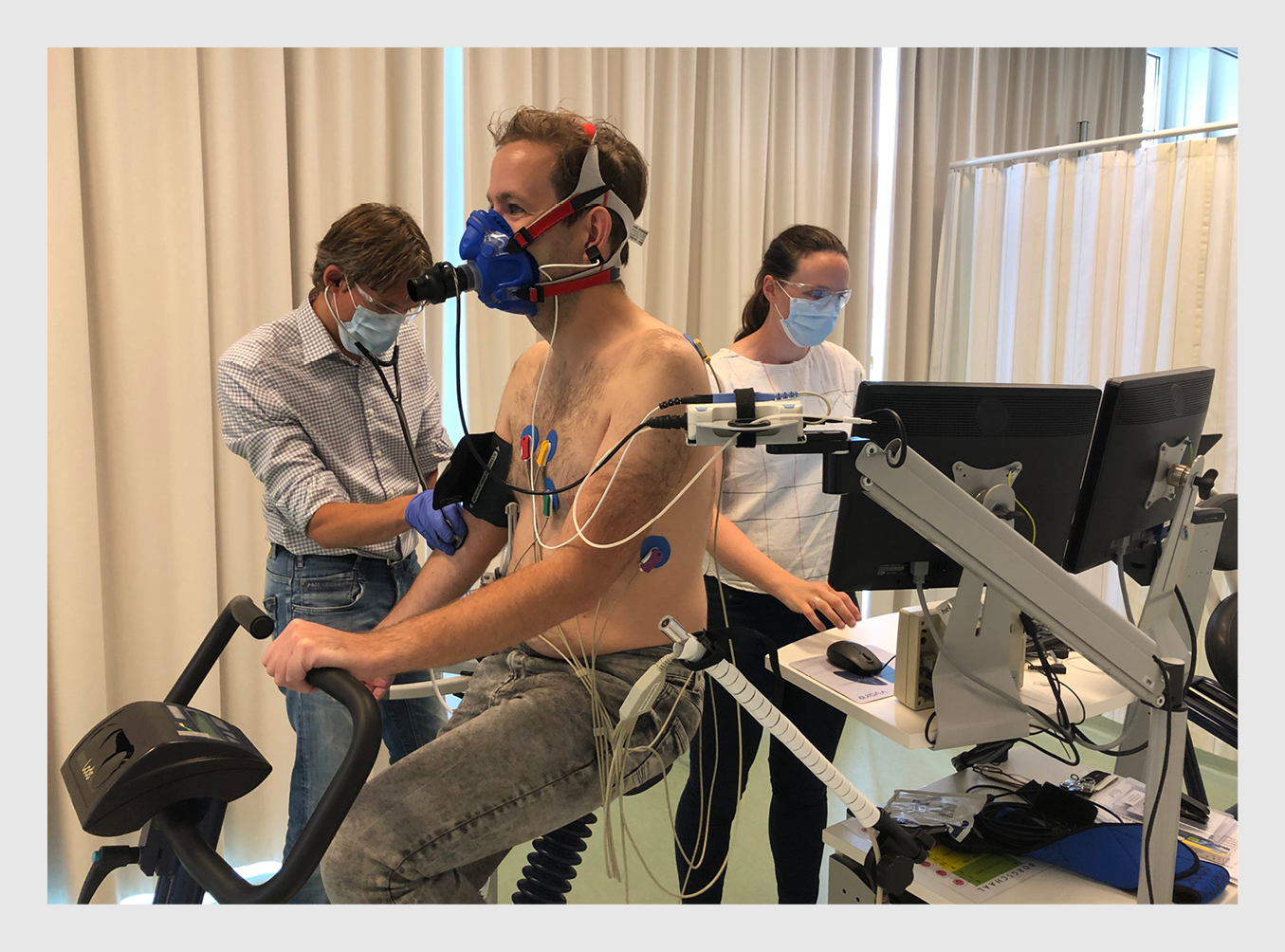 We voerden de maximale inspanningstesten uit op een (lig)fietsergometer volgens een standaard getrapt protocol (‘ramp protocol’) met ademgasanalyse, ecg-registratie, bloeddruk- en saturatiemeting (figuur 1).3 Een sportarts en een assistent voerden het onderzoek uit, waarbij ze de infectiepreventierichtlijnen van de Federatie Medisch Specialisten en Vereniging voor Sportgeneeskunde in acht namen.4-8