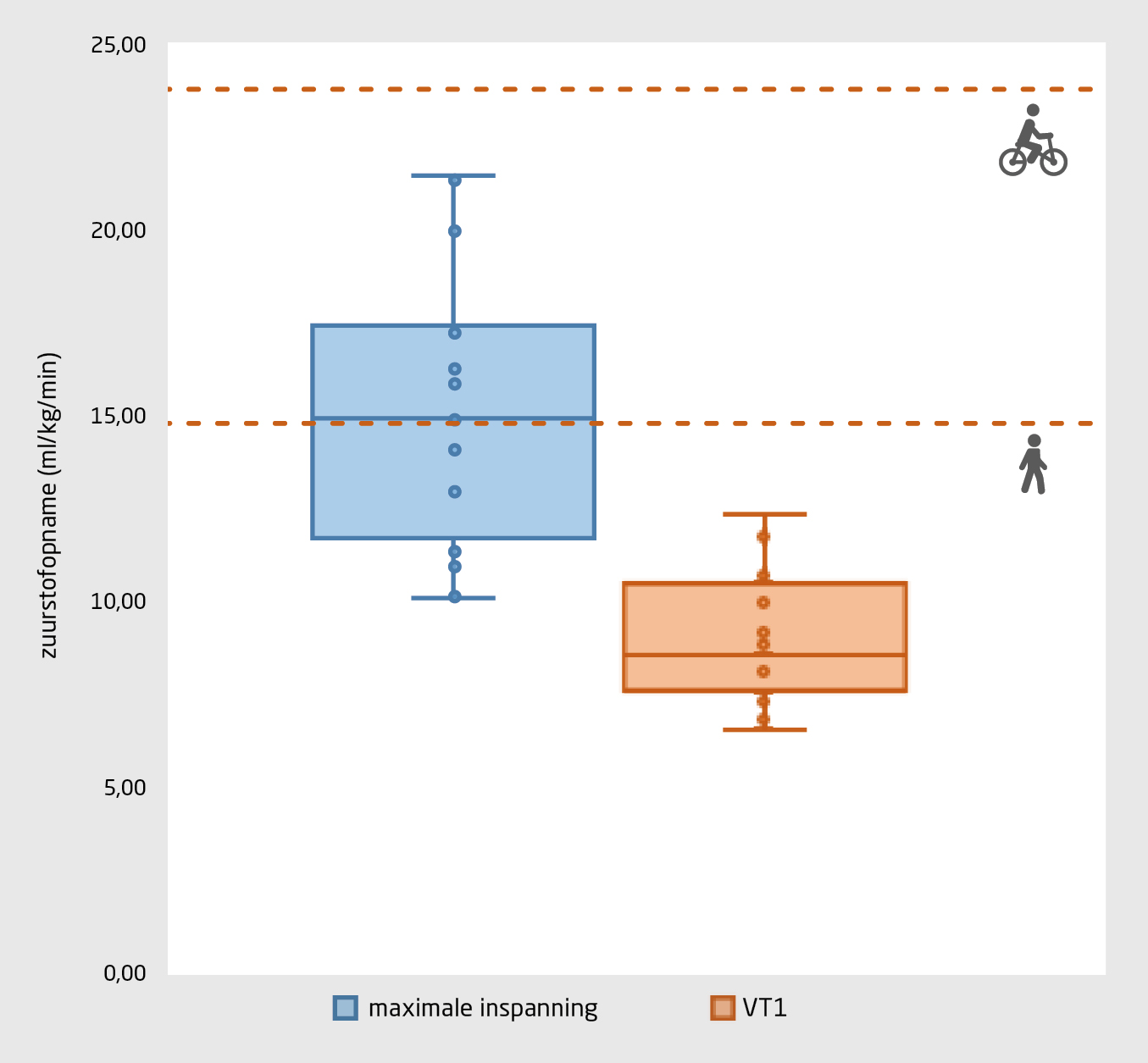 We beschreven de inspanningscapaciteit aan de hand van de piekzuurstofopname, de gouden standaard voor algehele fysieke fitheid, en zuurstofopname op de eerste ventilatoire drempel (VT1). Deze drempel is de mate van inspanning waarbij een eerste lichte stijging van de concentratie lactaat in het bloed optreedt. De inspanning die op dat moment geleverd wordt ervaart men als matig intensief.13 De zuurstofopname werd uitgedrukt in ml/kg/min en als het percentage van de zuurstofopname die op basis van geslacht en leeftijd wordt verwacht.3