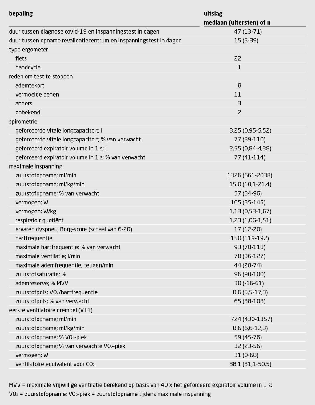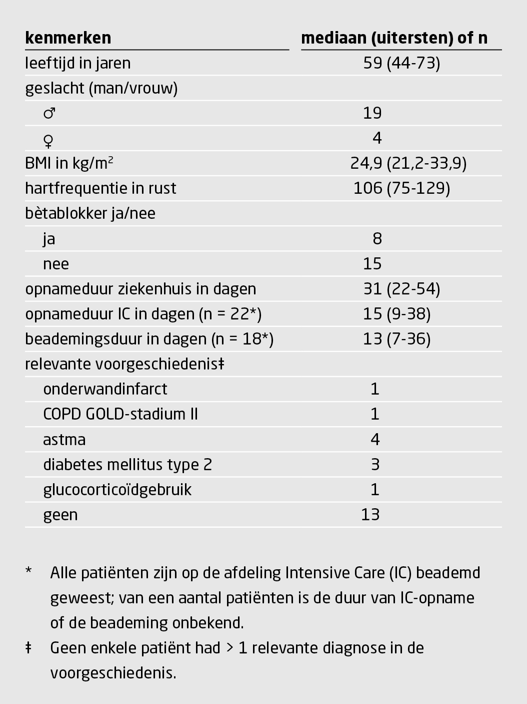 Tijdens de inspanningstest bereikten 23 patiënten hun maximale inspanningscapaciteit. Eén patiënt stopte de test vroegtijdig volgens onze criteria en is daarom niet meegenomen in de analyse. Van de overige deelnemers was de meerderheid man; de mediane leeftijd was 59 jaar en de mediane BMI 24,9 kg/m2 (tabel 1). Deze patiënten waren mediaan 15 dagen op de afdeling IC opgenomen en 13 dagen beademd geweest. Er zijn geen complicaties opgetreden bij de inspanningstesten. Wel werd bij 1 patiënt werd de test vroegtijdig afgebroken vanwege een verlaagde saturatie (< 90%). Deze patiënt was bekend met COPD (GOLD-stadium II).