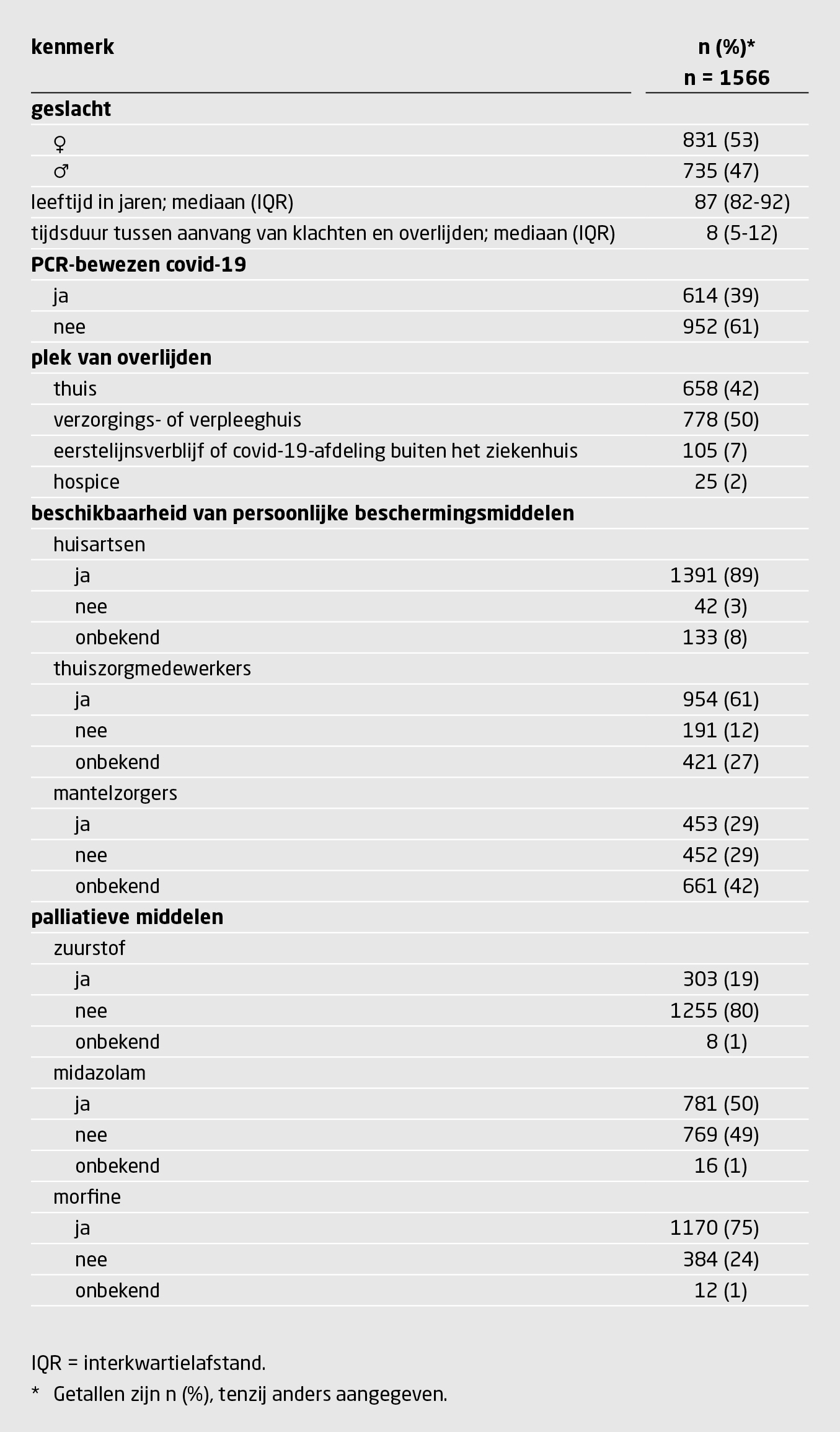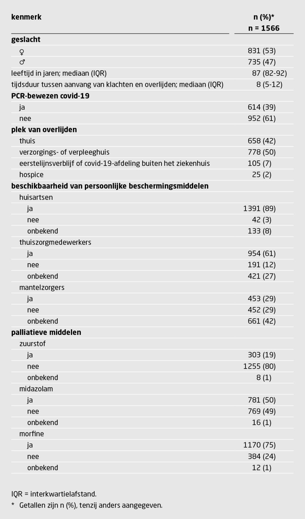 Huisartsen uit 2331 (46%) van alle 5020 huisartsenpraktijken in Nederland meldden in totaal 1566 overlijdens (mediane leeftijd: 87 jaar) buiten het ziekenhuis, vooral in Noord-Brabant en Limburg. Bij 952 (61%) was de SARS-CoV-2-infectie niet aangetoond met een PCR-test. De mediane tijdsperiode tussen de aanvang van de klachten en het overlijden was 8 dagen. In totaal kregen 1030 patiënten intensieve zorg buiten het ziekenhuis, van wie het merendeel (56%) een CFS-score van 6 of hoger had. De vaakst genoemde redenen om patiënten niet te verwijzen naar het ziekenhuis, waren de wens van de patiënt (59%) en somatische kwetsbaarheid (52%).