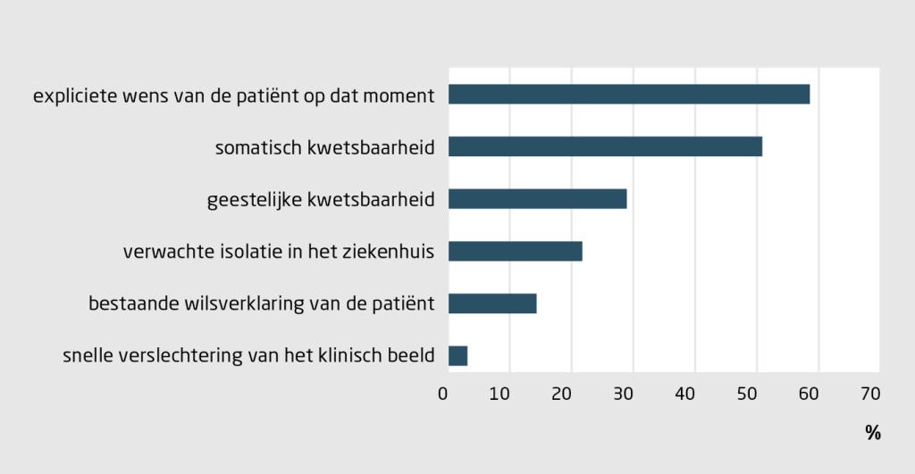 De vaakst genoemde redenen om patiënten niet te verwijzen naar het ziekenhuis, waren de wens van de patiënt (59%) en somatische kwetsbaarheid (52%) (zie tabel 2 en figuur 4). Een hoge CFS-score was gerelateerd aan alle redenen om patiënten niet te verwijzen naar het ziekenhuis, behalve verwachte isolatie. Niet-kwetsbare patiënten bleven statistisch significant vaker thuis omdat dit hun wens was, vergeleken met kwetsbare patiënten. Bij 541 (53%) patiënten gaf de huisarts maar één reden op, namelijk de wens van de patiënt (32%), somatische kwetsbaarheid (11%), verwachte isolatie (3%) of een bestaande wilsverklaring (2%). Bij 312 (30%) patiënten werden 2 redenen genoemd, bij 147 (14%) patiënten 3 redenen en bij 28 (3%) 4 of meer.