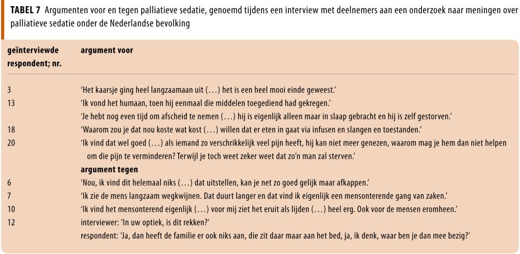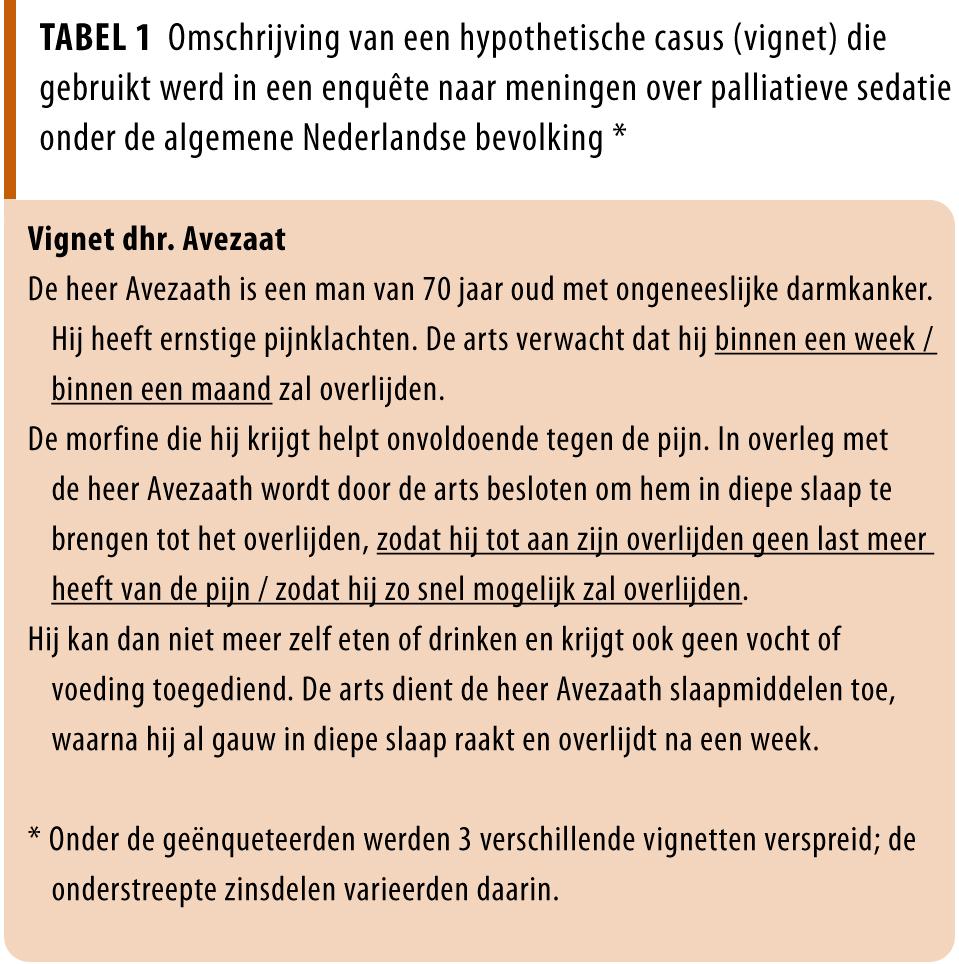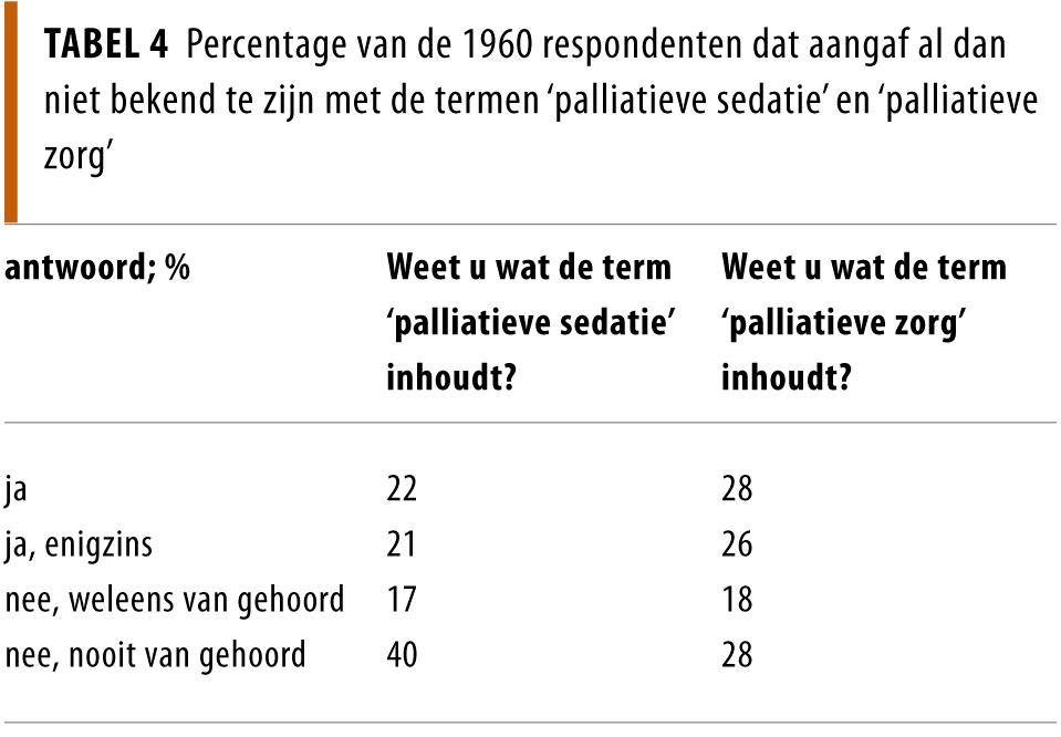 In totaal gaf 22% van de respondenten aan de term ‘palliatieve sedatie’ te kennen. Uit de interviews bleek dat er verschillende ideeën bestaan over wat de term behelst. 81% van de respondenten was het eens met de toepassing van sedatie zoals beschreven in een vignet van een patiënt met onbehandelbare pijn en een levensverwachting van minder dan 1 week, bij wie de sedatie werd ingezet om het lijden te verlichten. Dit percentage was lager (74%; p = 0,007) bij een levensverwachting van minder dan 1 maand, maar vergelijkbaar wanneer de sedatie werd ingezet om de dood te bespoedigen (79%, p = 0,54).