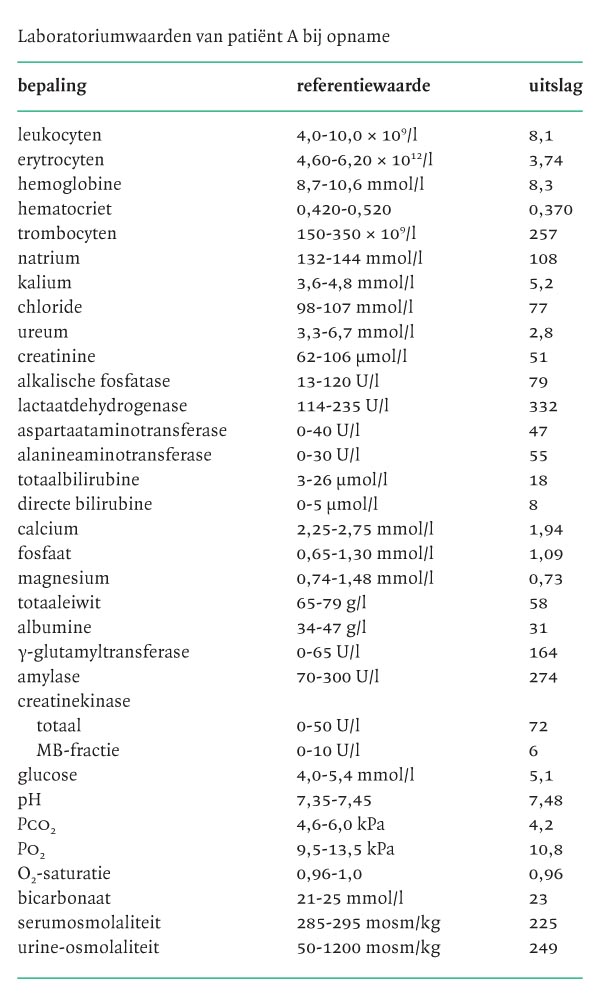 Patiënt A, een 61-jarige man met een blanco medische voorgeschiedenis, bezocht de huisarts vanwege kortademigheid. Sinds enkele weken was hij toenemend kortademig geworden, aanvankelijk bij inspanning en later ook in rust. Hierbij had hij geen koorts en hoestte hij niet. De huisarts had patiënt een prednisolon- en doxycyclinekuur voorgeschreven en toen de klachten hiermee niet verbeterden, werd deze medicatie omgezet in amoxicilline-clavulaanzuur. Ondanks de ingestelde therapie nam de kortademigheid toe en daarom werd patiënt verwezen naar de longarts in een ander ziekenhuis. Hier kwam bij laboratoriumonderzoek een ernstige hyponatriëmie naar voren, waarop patiënt wegens plaatsgebrek op de intensive care (IC) in het eigen ziekenhuis naar ons werd doorverwezen. De werkdiagnose luidde ‘ernstige bedreigende hyponatriëmie bij een primair longlijden’. Vanwege de mogelijke neurologische complicaties van de hyponatriëmie werd een IC-opname noodzakelijk geacht.