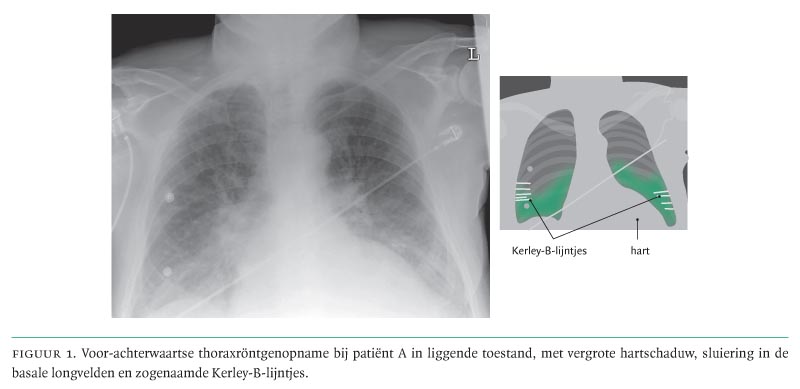 Het ECG toonde een sinusritme van 83/min. Er waren Q-toppen in afleiding III, aVR en V1-V3. De geleidingstijden waren niet verlengd. De thoraxfoto toonde een fors hart met sluiering van met name de basale longvelden (figuur 1). Er waren zogenaamde Kerley-B-lijntjes zichtbaar.