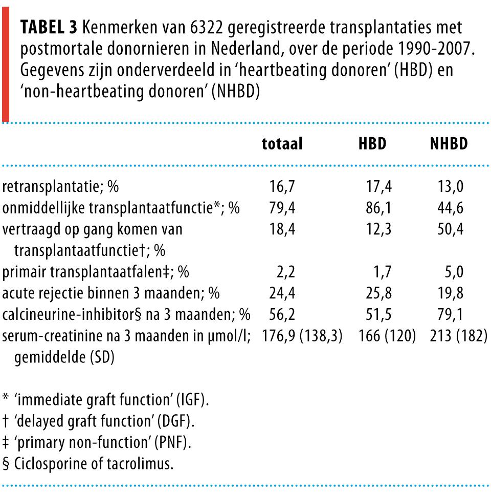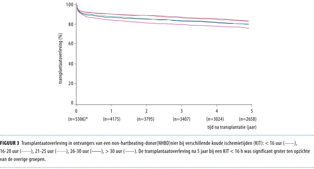 We bestudeerden 6322 ontvangers van postmortale donornieren, van wie 5306 patiënten een nier kregen van een donor met intacte circulatie (‘heartbeating donor’, HBD) en 1016 van een donor met een hartstilstand (‘non-heartbeating donor’, NHBD). De gemiddelde KIT was 24,0 h in de HBD-groep en 21,6 h in de NHB-groep. Het percentage vertraagd op gang komen van de transplantaatfunctie (‘delayed graft function’ (DGF)) bedroeg 12,3% in de HBD-groep en 50,4% in de NHBD-groep. Bij multivariate analyse bleek een langere KIT een onafhankelijke risicofactor voor transplantaatfalen. Verder was een langere KIT geassocieerd met het vaker optreden van DGF en primair transplantaatfalen (‘primary non-function’ (PNF)). HBD-niertransplantaten met een KIT ≤ 20 h hadden een 3% betere 5-jaars-transplantaatoverleving dan de groep met een langere KIT. Bij NHBD-niertransplantaten was de transplantaatoverleving bij een KIT