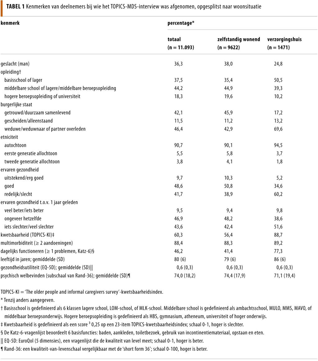 In totaal werden 11.093 ouderen met een gemiddelde leeftijd van 80 jaar (SD: 6) geïnterviewd voor TOPICS-MDS (tabel 1). Ongeveer een derde (36,3%) was man, een vijfde (18,3%) had hoger onderwijs genoten en bijna de helft (46,4%) was weduwe of weduwnaar. In vergelijking met zelfstandig wonende deelnemers waren deelnemers in een verzorgingshuis gemiddeld ouder, vaker vrouw en weduwe of weduwnaar, hadden ze een lagere opleiding genoten en een slechtere zelfgerapporteerde gezondheid. Kwetsbaarheid, multimorbiditeit en adl-beperkingen kwamen voor bij een aanzienlijk deel van de ouderen die zelfstandig woonden (respectievelijk 56,4%, 88,3% en 41,4%). Bij ouderen in een verzorgingshuis waren deze aantallen aanzienlijk hoger (respectievelijk 88,7%, 89,2% en 77,3%).