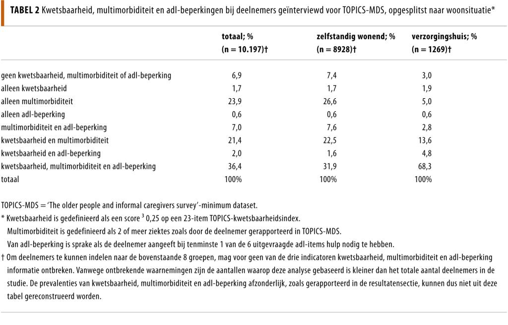 11.093 ouderen werden geïnterviewd. Bij een aanzienlijk deel van de zelfstandige wonende ouderen die deelnamen aan het NPO kwamen kwetsbaarheid, multimorbiditeit en/of adl-beperkingen voor (respectievelijk 56,4%, 88,3% en 41,4%), evenals bij ouderen in een verzorgingshuis (respectievelijk 88,7%, 89,2% en 77,3%). Van de zelfstandig wonende ouderen rapporteerde een derde (31,9%) alle 3 de condities, tegen twee derde (68,3%) van de ouderen in een verzorgingshuis. In de multivariabele analyse had kwetsbaarheid een sterk effect op de uitkomsten, onafhankelijk van multimorbiditeit en adl-beperkingen. Ouderen die te maken hadden met problemen in alle 3 de domeinen rapporteerden de slechtste kwaliteit van leven en de hoogste zorgkosten, ongeacht hun woonsituatie.