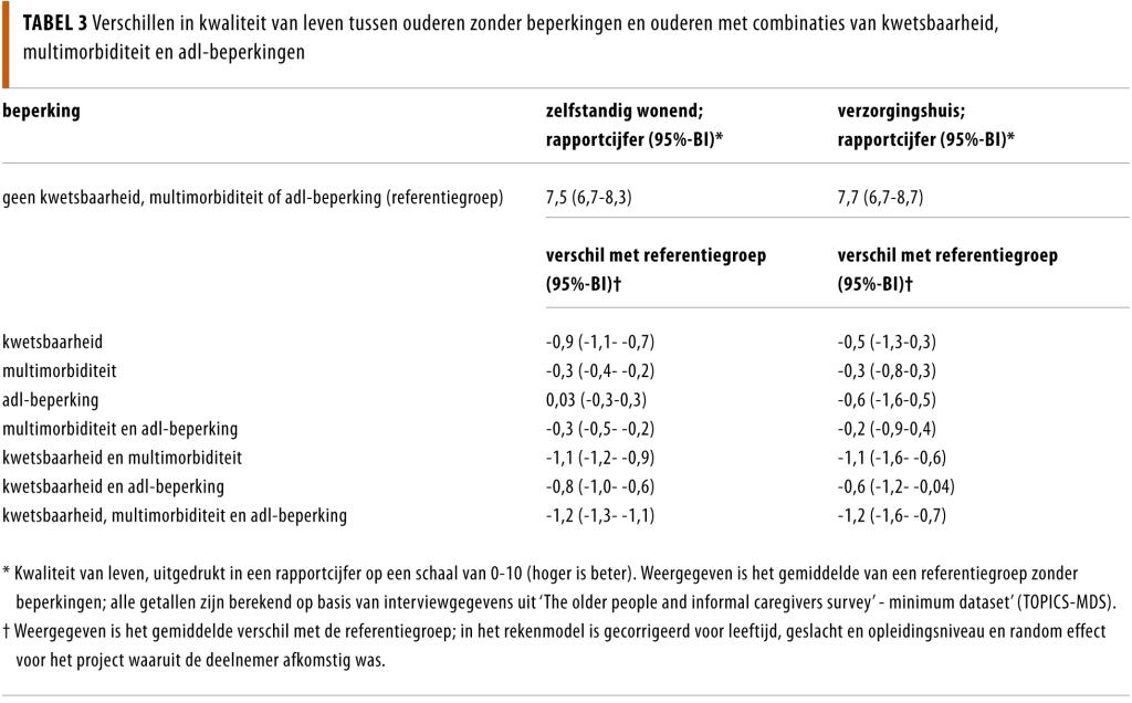 In model 1, met kwaliteit van leven als uitkomstvariabele, bestond de referentiegroep uit zelfstandig wonende deelnemers die geen kwetsbaarheid, multimorbiditeit of adl-beperkingen hadden gerapporteerd; hun gemiddelde rapportcijfer voor kwaliteit van leven was 7,5 (95%-BI: 6,7-8,3). Tabel 3 geeft een overzicht van de verschillen in kwaliteit van leven tussen deze referentiegroep en de groepen met combinaties van kwetsbaarheid, multimorbiditeit en adl-beperkingen.