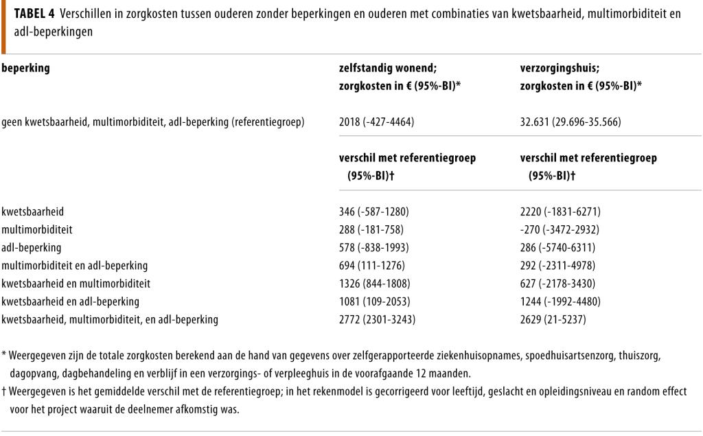 Het hebben van adl-beperkingen had het grootste effect op de zorgkosten. Gemiddeld gaven ouderen die zelfstandig woonden en alleen adl-beperkingen hadden gerapporteerd € 578 (95%-BI: -838-1993) meer uit aan gezondheidszorg dan de referentiegroep. Multimorbiditeit had de minst onafhankelijke invloed (€ 288 meer uitgegeven; 95%-BI: -181-758). Geen van deze verschillen was echter statistisch significant. Ouderen met kwetsbaarheid, multimorbiditeit én adl-beperkingen meldden statistisch significant hogere kosten voor gezondheidszorg; gemiddeld gaven ze € 2772 (95%-BI: 2301-3243) per jaar meer uit dan de referentiegroep.