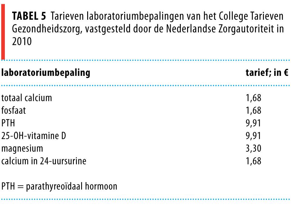De tarieven van de meest aangevraagde parameters in het kader van calciummetabolisme, vastgesteld door het College Tarieven Gezondheidszorg (CTG), staan in tabel 5.