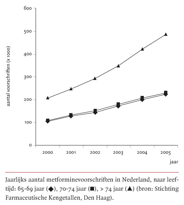 Het gebruik van metformine bij de behandeling van patiënten met diabetes mellitus type 2 neemt snel toe sinds in 1998 gunstige resultaten met dit middel werden gepubliceerd.1 Volgens de Stichting Farmaceutische Kengetallen bedroeg het totale aantal metforminevoorschriften in 2005 1.603.000 en bij patiënten van 70 jaar en ouder ruim 700.000. De sterkste stijging van het aantal voorschriften is waargenomen bij patiënten van 75 jaar of ouder (figuur). Nu de herziene standaard ‘Diabetes mellitus type 2’ van het Nederlands Huisartsen Genootschap metformine als oraal antidiabeticum van eerste keus aanwijst, zal het gebruik naar verwachting alleen nog maar verder toenemen (http://nhg.artsennet.nl/uri/?uri=AMGATE_6059_104_TICH_R1690081092740334).2