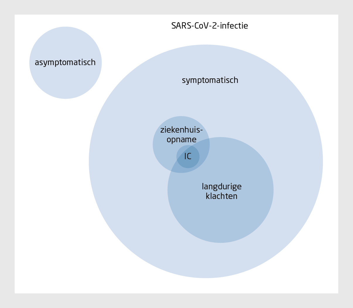 Het is duidelijk dat covid-19 gepaard kan gaan met langdurige klachten en beperkingen, functionele en structurele afwijkingen en een verhoogd risico op bijkomende aandoeningen. De zorg wordt in toenemende mate geconfronteerd met mensen die langdurige klachten ervaren na een doorgemaakte SARS-CoV-2-infectie. Hoewel er inmiddels een consensusdefinitie van long covid is, is het niet mogelijk om de diagnose ‘long covid’ te stellen vanwege een gebrek aan objectieve diagnostische criteria. Hierdoor wordt ook de interpretatie van cijfers over het vóórkomen van long covid in de verschillende wetenschappelijke publicaties bemoeilijkt. De klachten en afwijkingen waarmee patiënten zich presenteren zijn divers en variëren in ernst. Er zijn geen klachten gedefinieerd die essentieel zijn voor het stellen van de diagnose of daaraan bijdragen. Dat geldt ook voor de minimale ernst van deze klachten. Bovendien zijn er geen universeel geaccepteerde meetinstrumenten en zijn de klachten niet uniek of specifiek voor long covid. Ook waren sommige klachten misschien in mindere mate al langdurig aanwezig vóór de infectie. Een aantal studies suggereert dat de langdurige klachten van mensen na covid-19 meer uitgesproken zijn dan die van mensen na bijvoorbeeld een influenza-infectie.21 Toch blijft de vraag of long covid verschilt van andere postinfectieuze syndromen. Langdurige vermoeidheid, neurocognitieve problemen, stemmingsstoornissen en musculoskeletale pijn worden ook gerapporteerd na acute infectie met het Epstein-Barr-virus, Coxiella burneti (Q-koorts) en het Ross River-virus.22 Ook de gegevens van eerdere coronavirusepidemieën laten zien dat veel patiënten met een doorgemaakt ‘severe acute respiratory syndrome’ (SARS) of ‘Middle East respiratory syndrome’ (MERS) langdurige symptomen ervaren.23,24 De omvang van de populatie met langdurige klachten na covid-19, biedt mogelijkheden voor onderzoek naar de mogelijke gemeenschappelijke en verwekkerspecifieke mechanismen die ten grondslag liggen aan deze postinfectieuze syndromen en naar potentiële interventies.