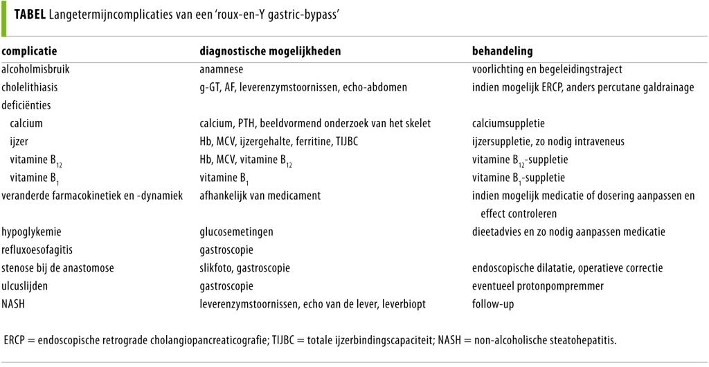 Zowel de patiënt als de arts moet mogelijke complicaties van een bariatrische ingreep tijdig diagnosticeren, behandelen en vervolgen. De chirurgische richtlijn ‘Morbide obesitas’ adviseert om bij de indicatiestelling een multidisciplinair team te betrekken.5 Na een gastric-bypassoperatie is een goede follow-up cruciaal. De huidige richtlijnen adviseren controleafspraken na 1 maand, 2 maal per jaar voor de eerste 2 postoperatieve jaren en daarna een jaarlijkse follow-up van het klinisch beeld, passageklachten en andere klachten, en de vitaminestatus. Er is ruimte voor eigen interpretatie van de richtlijn: men kan zich afvragen bij welke specialist de patiënt het beste terug kan komen en of er meer controleafspraken gewenst zijn op basis van de bevindingen. Wij adviseren echter een gestructureerde follow-up met multidisciplinaire aanpak; daarnaast adviseren wij postoperatief te starten met suppletie van onder andere calcium, vitamine B, C en D, foliumzuur en ferrofumaraat. Ook protonpompremming kan worden overwogen, hoewel daarvan nog weinig klinische voordelen zijn aangetoond.