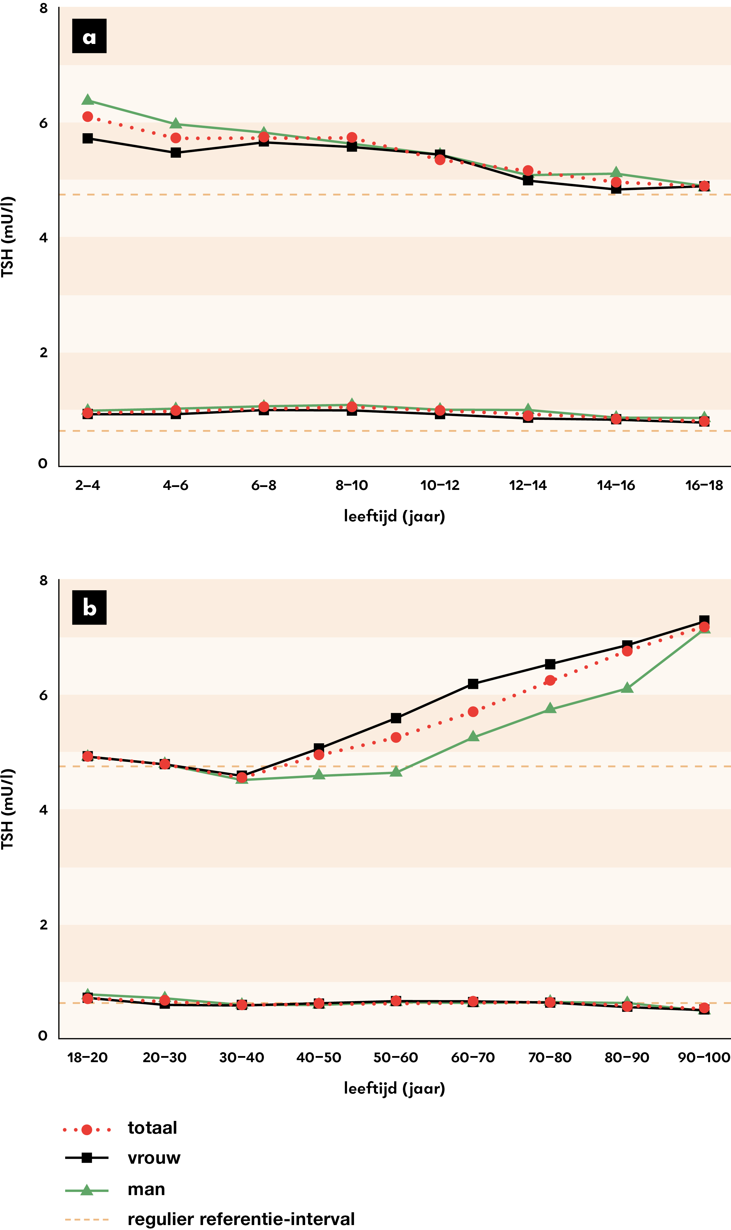 Bij volwassenen stegen de bovengrenzen van de TSH-referentie-intervallen bij vrouwen vanaf 50 jaar en bij mannen vanaf 60 jaar, terwijl de ondergrenzen stabiel bleven tot de leeftijd van 80 jaar. Voor FT4 stegen de bovengrenzen van de referentie-intervallen vanaf 70 jaar. De ondergrenzen bleven stabiel bij zowel vrouwen als mannen. In figuur 1 laten we als voorbeeld de TSH-referentie-intervallen zien voor kinderen (figuur 1a) en volwassenen (figuur 1b), gemeten met de Roche-methode. Voor figuren en data van de overige meetmethodes verwijzen we naar de oorspronkelijke publicatie van dit onderzoek.10