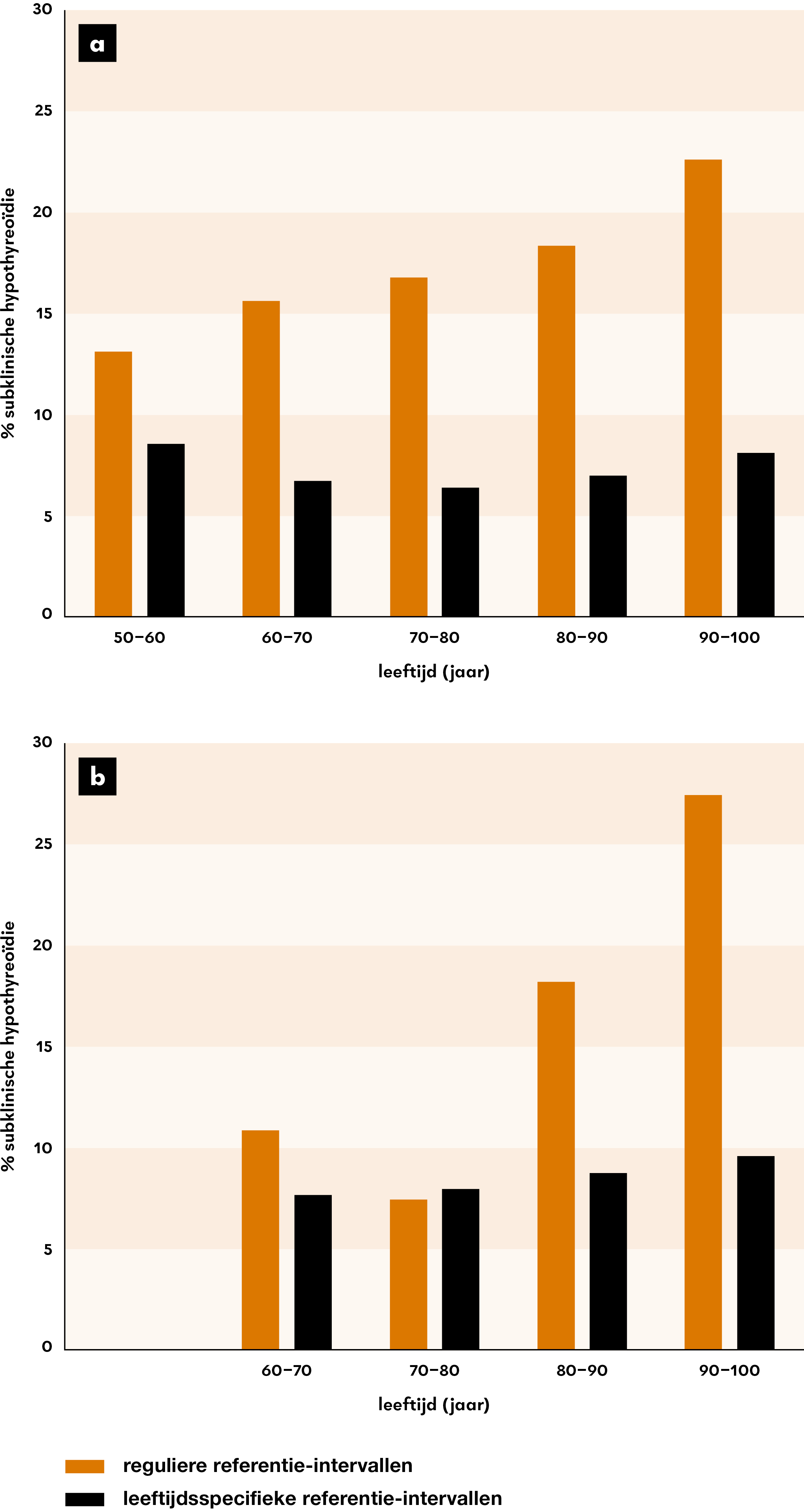 We onderzochten ook welke impact de toepassing van onze leeftijds- en geslachtsspecifieke referentie-intervallen heeft op het aantal diagnoses van schildklieraandoeningen. Bij vrouwen tussen 50 en 60 jaar zagen we een afname van de diagnose ‘subklinische hypothyreoïdie’ van 13,1% naar 8,6%; bij vrouwen van 90 tot 100 jaar daalde dit percentage van 22,7 naar 8,1% (figuur 2a). Bij mannen van 60 tot 70 jaar was er een daling van 10,9 naar 7,7%, en in de groep van 90 tot 100 jaar daalde dit van 27,4 naar 9,6% (figuur 2b).