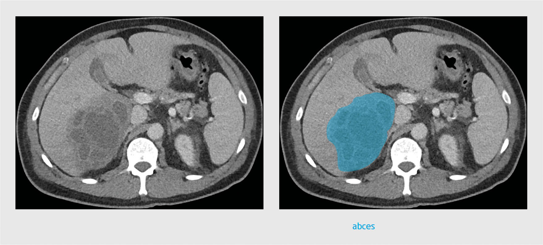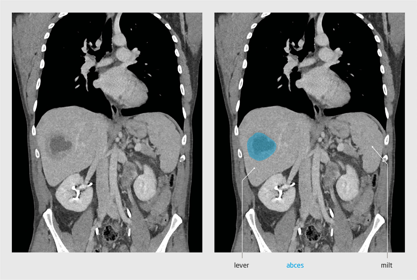 Vanwege de verdenking op een maligniteit werd CT verricht. De CT-scan toonde een leverabces in leversegment V (figuur 2). Daarop vond drainage van het abces door echogeleide punctie plaats. Kweek van drainagevocht toonde een Fusobacterium nucleatum aan . De behandeling bestond uit intraveneuze toediening van ceftazidim en metronidazol. Bij navraag bleek de patiënt 4 maanden eerder een kiesextractie te hebben ondergaan, wat de bron van de infectie geweest zou kunnen zijn.
