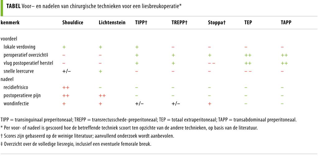 Als uroloog zie ik sinds de introductie van matjes bij liesbreuk correcties in toenemende mate pijnklachten in het verzorgingsgebied van de n. genitofemoralis. Deze complicatie treedt doorgaans pas laat op en wordt door huisartsen vaak toegeschreven aan scrotale problematiek. Hierdoor zal deze complicatie waarschijnlijk niet bekend zijn bij de auteurs. Ook is er door de TEP en vergelijkbare laparoscopische technieken een nieuwe complicatie geintroduceerd: blaasletsel. Al met al voor mij als uroloog een reden om patienten met een liesbreuk - die ik nogal eens zie - een matloze operatietechniek te adviseren.