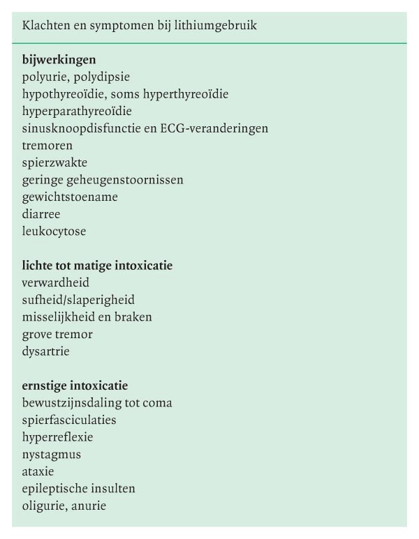 Lithium is een doeltreffend geneesmiddel voor de behandeling van patiënten met een bipolaire (manisch-depressieve) stoornis. Het is echter een middel met veel, potentieel ernstige bijwerkingen en een smalle therapeutische breedte. Frequente controle van de lithiumconcentratie en regelmatige controle op bijwerkingen dienen daarom plaats te vinden.