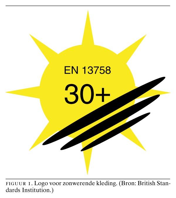 De British Standards Institution heeft een merkteken ontwikkeld voor zonwerende kleding. Daar staat een geel zonnetje op met de aanduiding 30+ (figuur 1). Een fabrikant die kleding van dit logo wil voorzien, moet die eerst laten testen door een erkend Europees bureau (nieuwsbericht van de British Standards Institution…